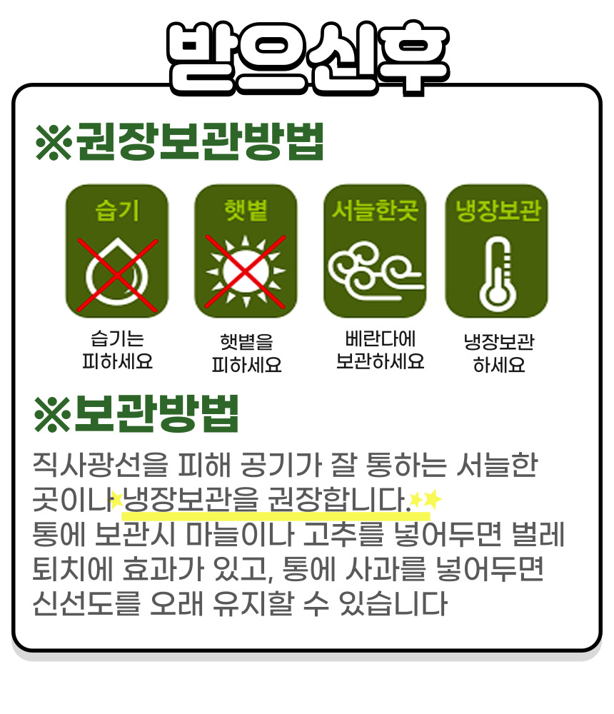 | 보관방법 또는 취급방법 | 직사광선을 피하고 서늘한 곳에 보관 | ||