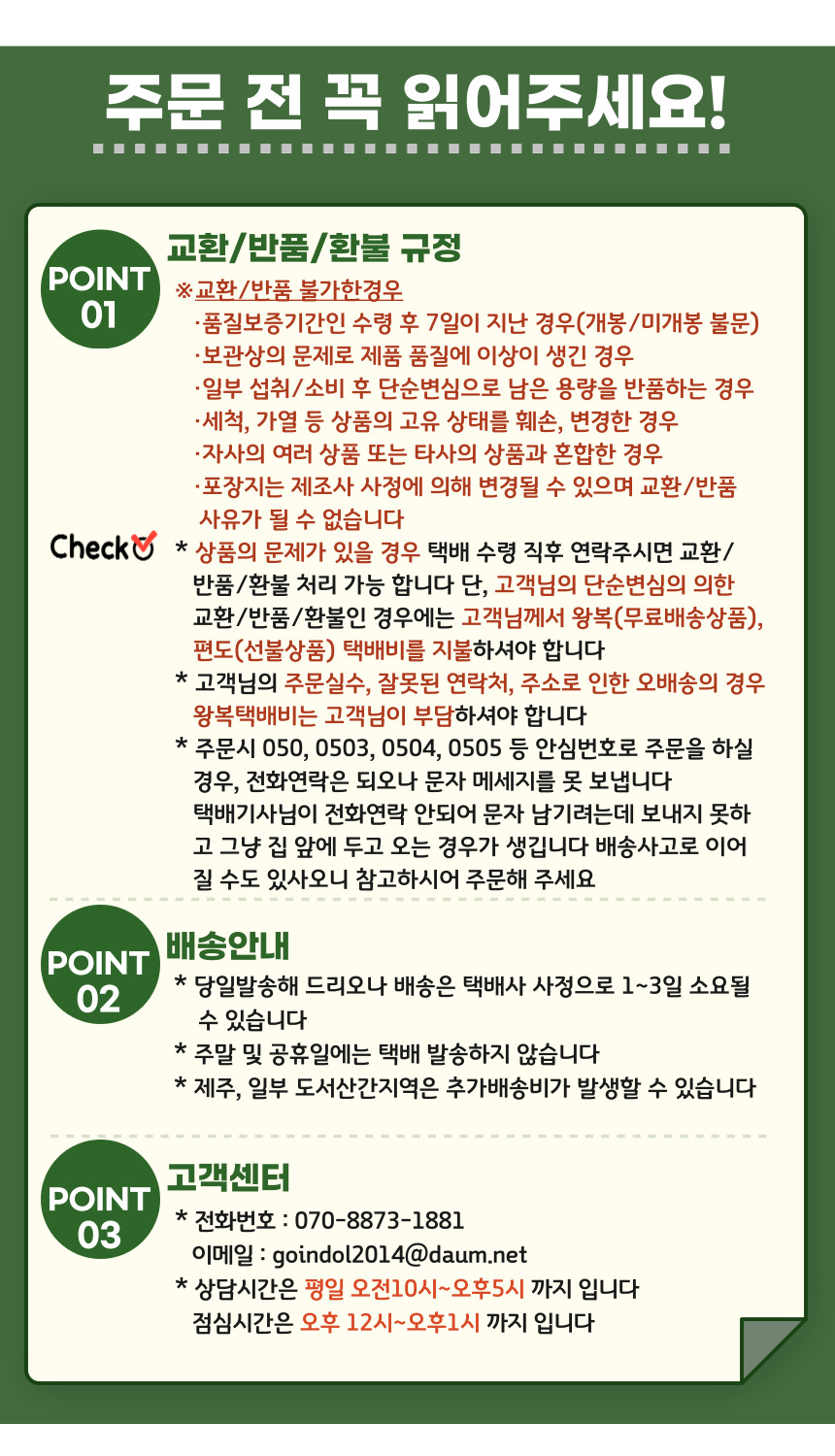 -. 고객님의 주문실수, 잘못된 연락처, 주소로 인한 오배송의 경우 왕복택배비는 고객님이 부담하셔야 합니다.