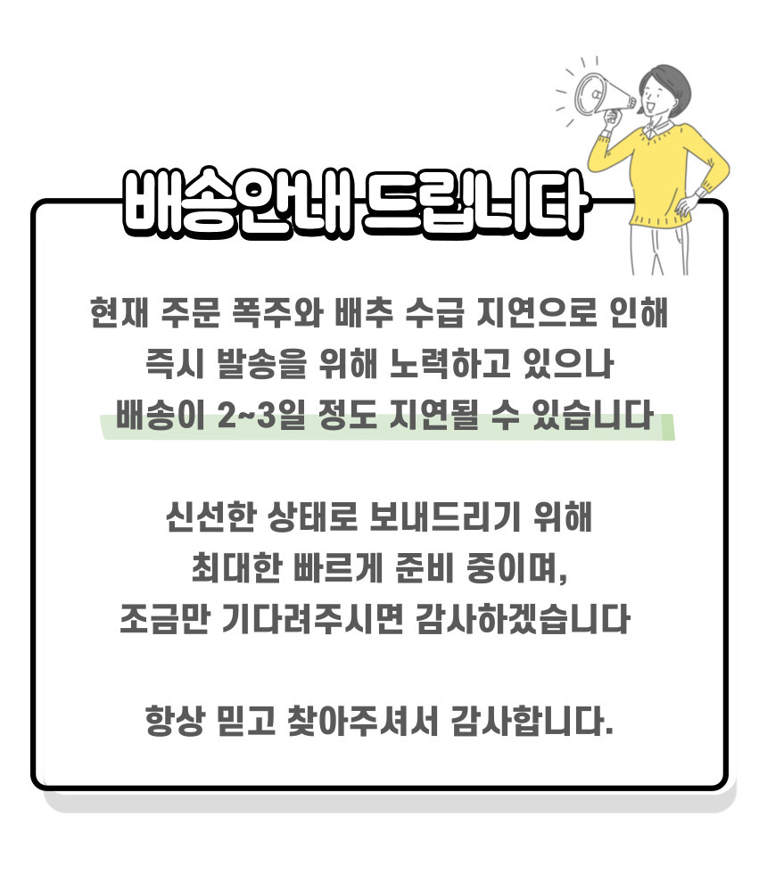 -. 택배는 익일배송을 원칙으로 하며, 택배사의 사정으로 1~3일 소요될 수 있습니다.
